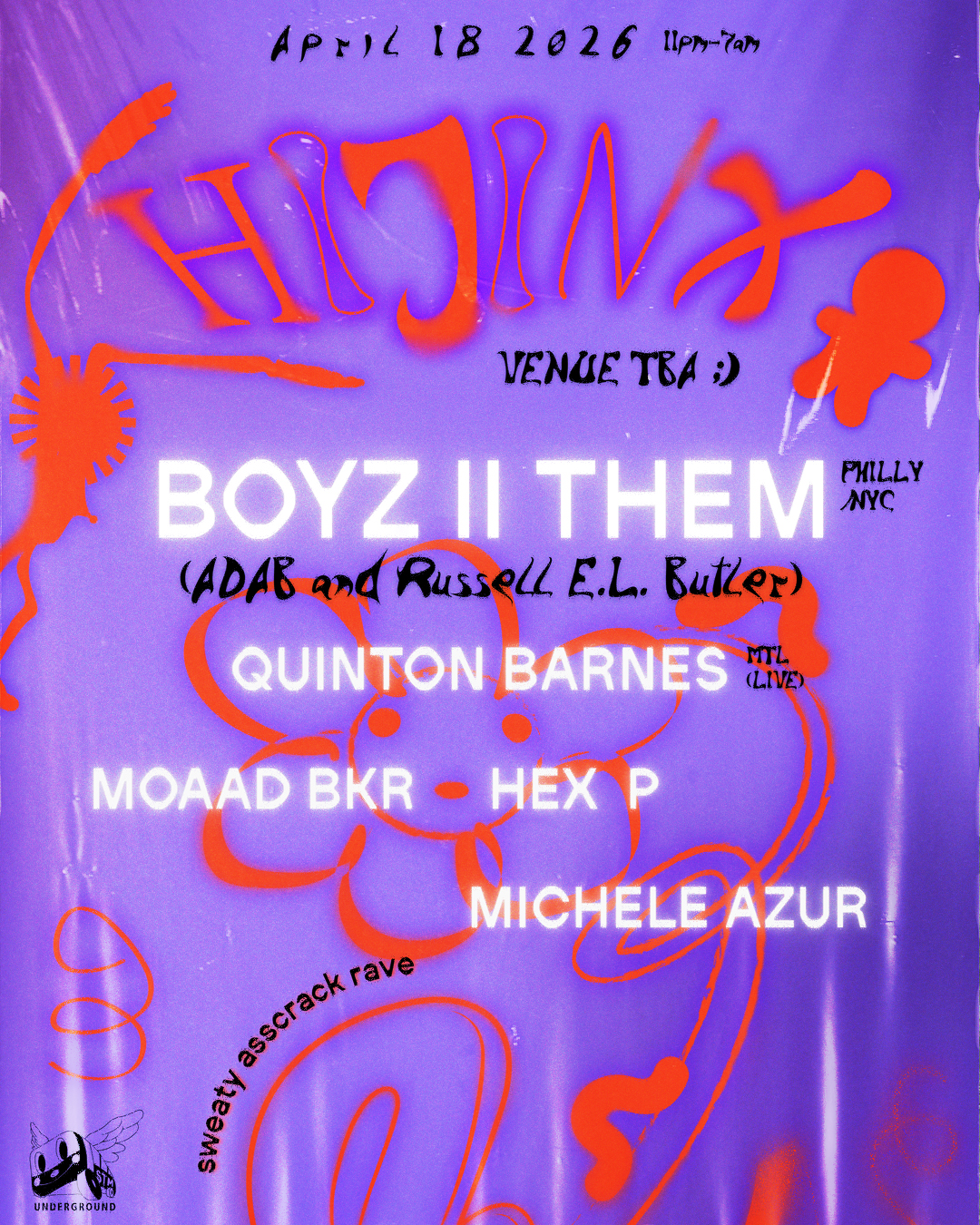 On Saturday the 18th of April, Hijinx is back with an all-night rager. We're excited to welcome ADAB and Russell E.L. Butler AKA Boyz II Them from the US of A. Warming up the decks is local vinyl slinger and Narrativ co-organizer Moaad BKR. At half-past rave o'clock, Montreal singer/rapper Quinton Barnes will perform a live dancefloor set. Hijinx hosts Michele Azur and Hex P will be serving up sweet honey tunes until 7am.